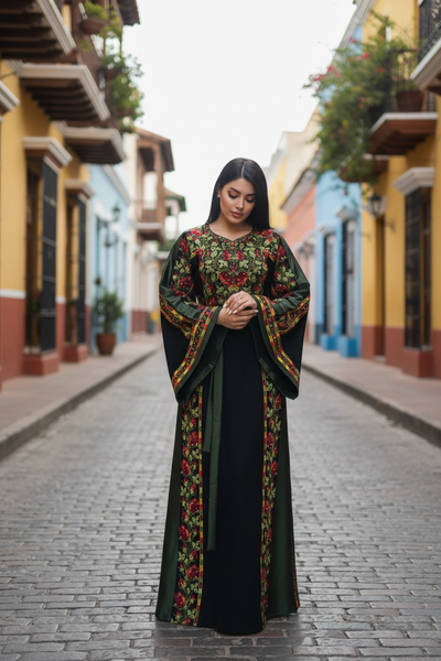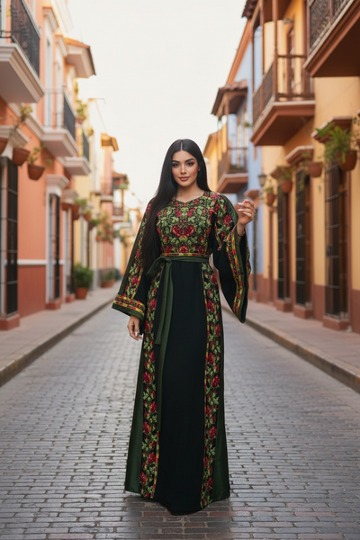 Green Covered in elegant floral Embroidered Palestinian Thobe