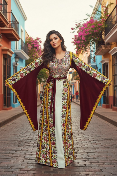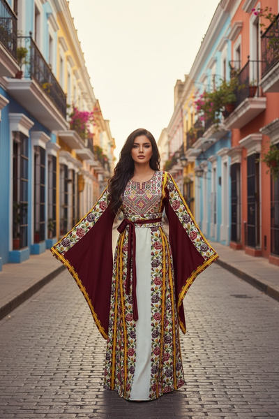 Perfect to wear as an Islamic Wedding dress, a pre-wedding Henna Party Dress, for Eid, or any special occasion. This thobe is embroidered in a classic Palestinian pattern. The front & back of this thobe are embroidered and embellished with crystal accents Machine embroidered, Imported from Jordan. Fabric is a very soft, comfortable, breathable