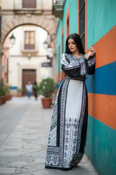 White & Black Color thoub Embroidered Palestinian Fellahi Thobe With Belt