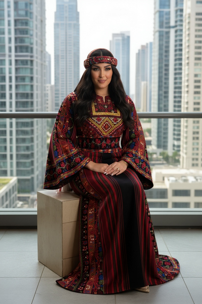 Luxury Black/ Red Majdalway Embroidered Palestinian Fellahi Thobe & Headpiece