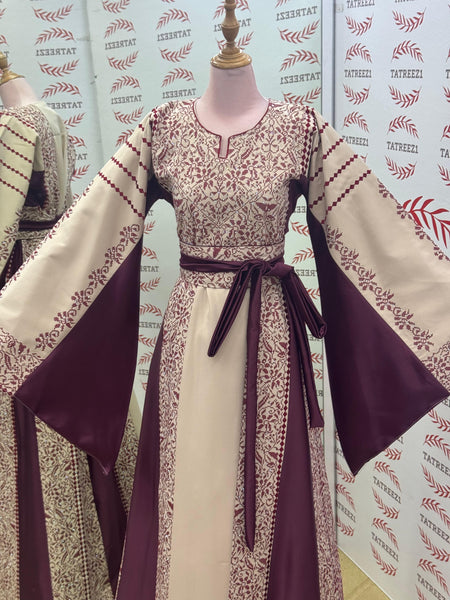 Maroon Tatreez Elegant Embroidered Palestinian Beige Dress