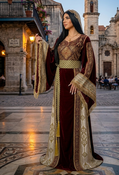Velvet Embroidery Thoub with Dangling Beads