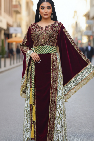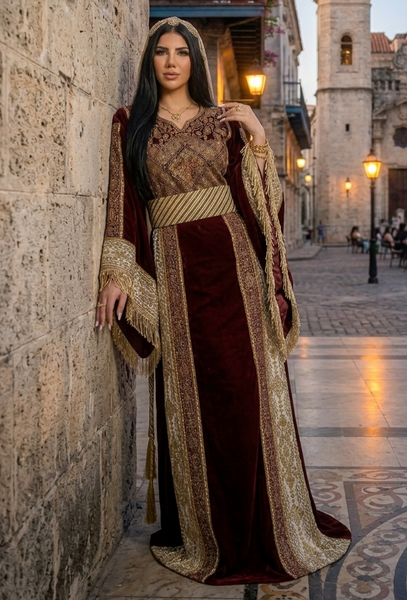 • Maroon silk Velvet Machine High Quality Embroidered Thobe