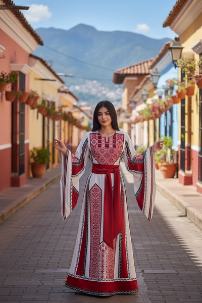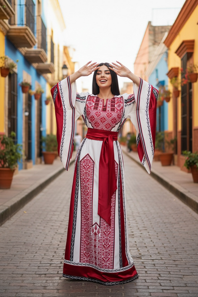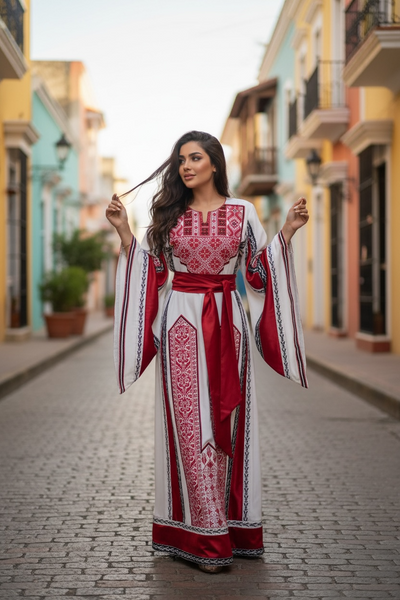 Perfect to wear as an Islamic Wedding dress, a pre-wedding Henna Party Dress, for Eid, or any special occasion. This thobe is embroidered in a classic Palestinian pattern. The front & back of this thobe are embroidered and embellished with crystal accents Machine embroidered, Imported from Jordan. Fabric is a very soft, comfortable, breathable