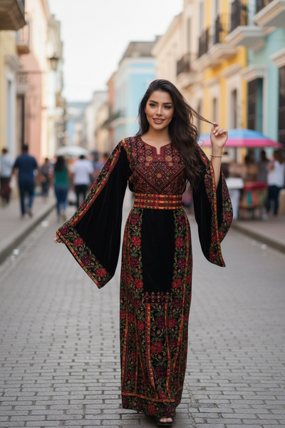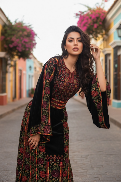 Velvet Midnight Bloomed Elegant Embroidered Palestinian Thobe